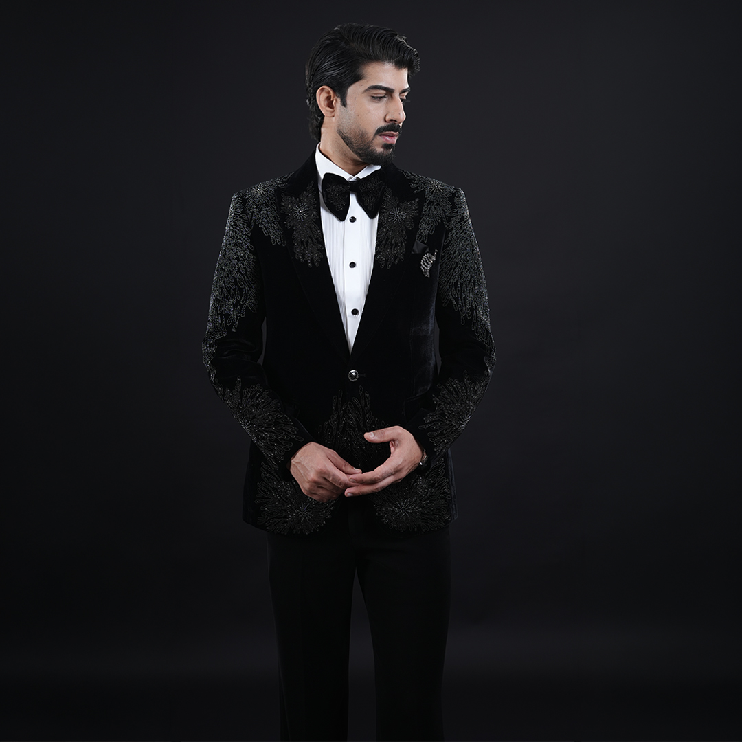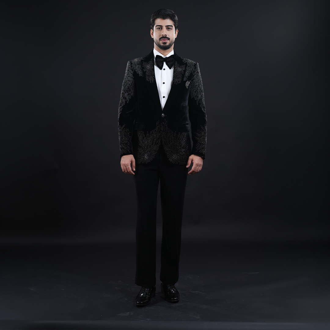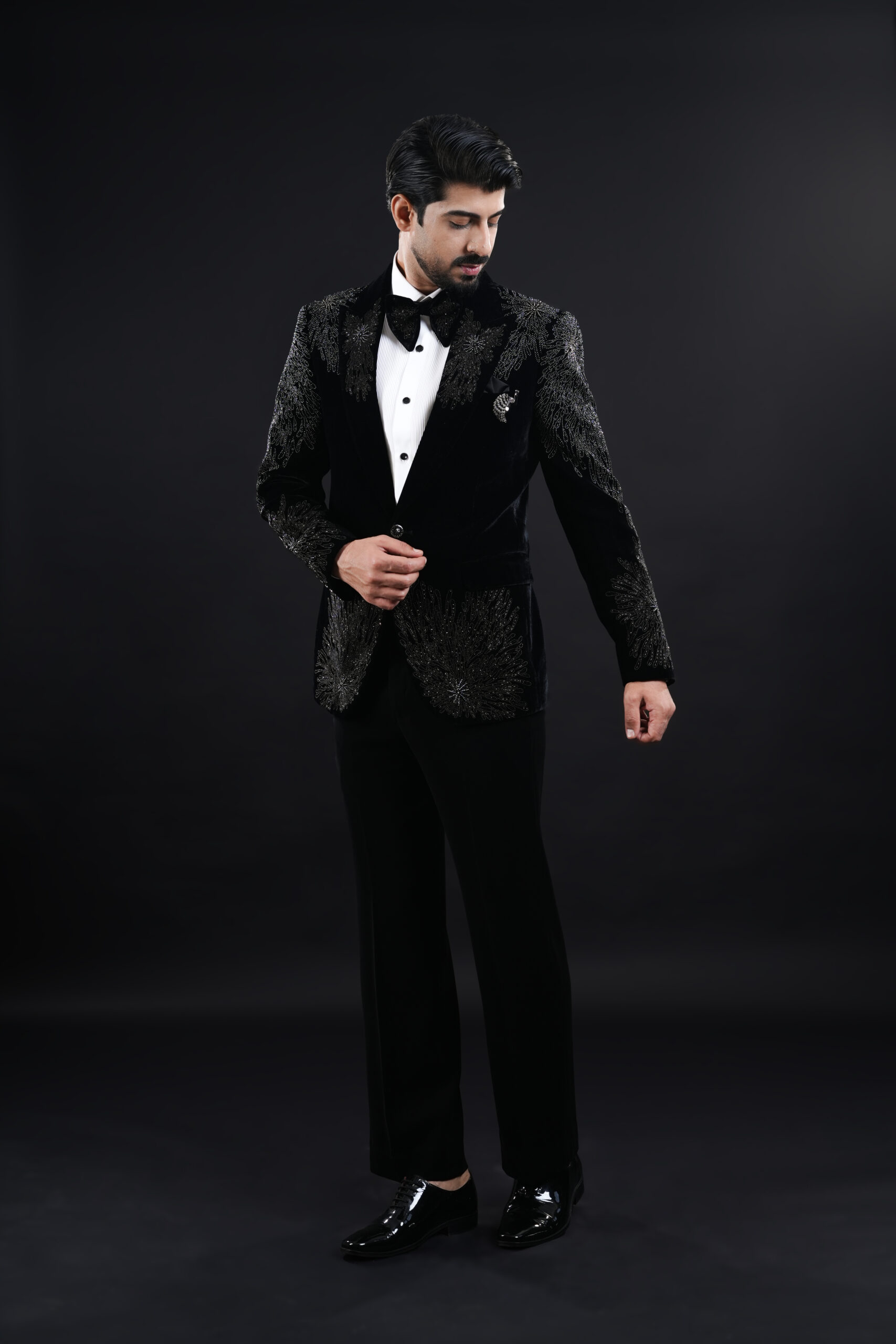 Featuring a Black tuxedo in Magna base with Black Cutdana, Studes & Pearls Hand embroidery. It is paired with a same pants and a bow. Perfect wear for engagement or reception ceremony.
