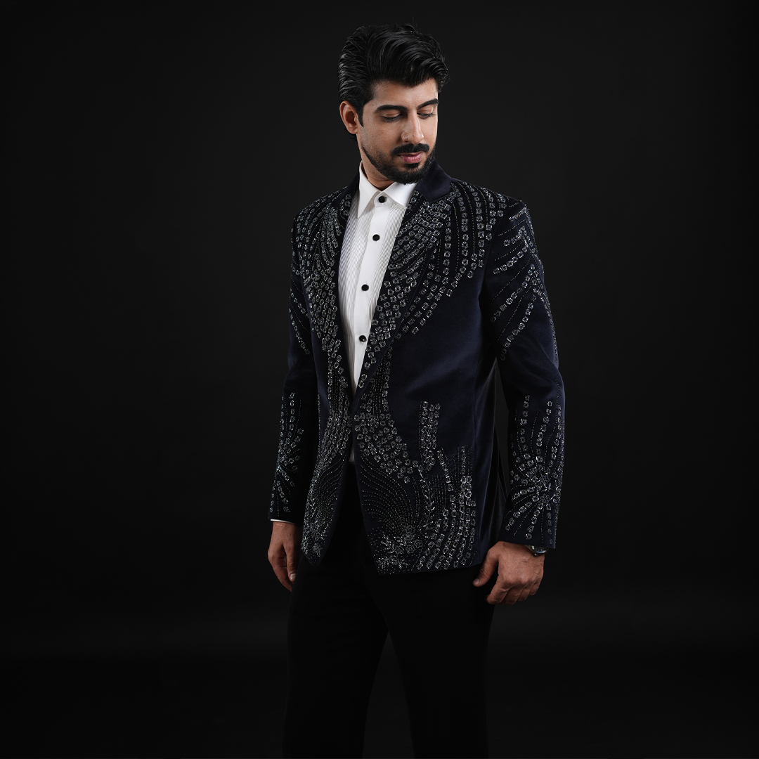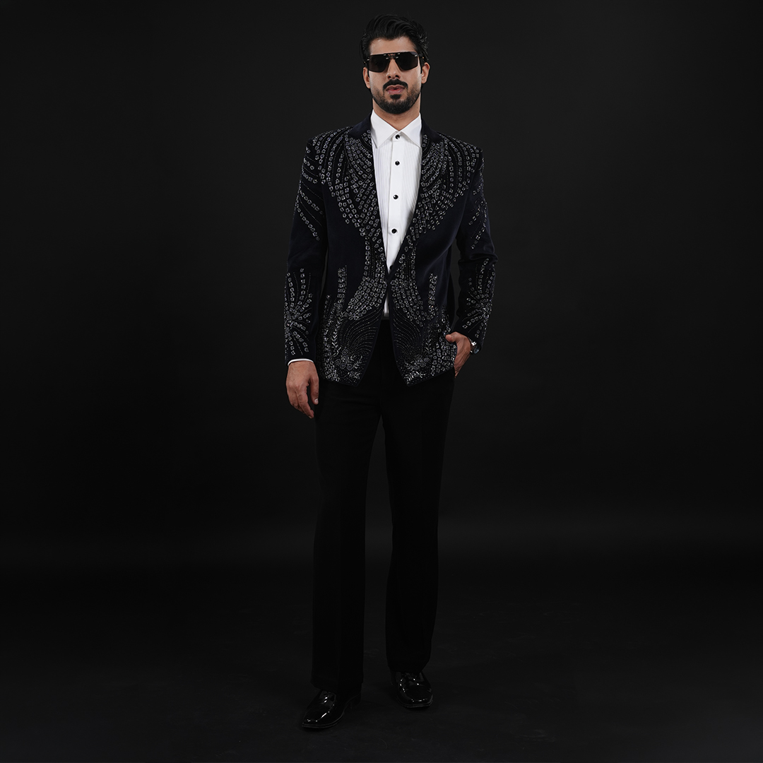 This refined Blue Suit is crafted from luxurious Velvet fabric and elevated with shimmering sequin and bead handwork that adds a sophisticated sparkle. Designed for modern men who appreciate elegance with a bold touch, this Suit delivers a striking yet timeless statement—perfect for receptions, cocktails, red-carpet events, and premium celebrations.